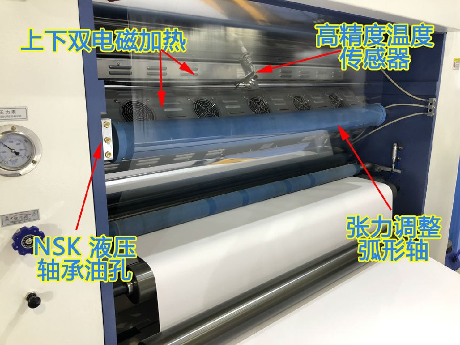 覆合部分采用直径400mm镜面覆合辊,也装有电磁加热装置,配合大干燥辊提高加热效率;直径300mm橡胶覆合辊采用gao级橡胶,保证覆合质量。
