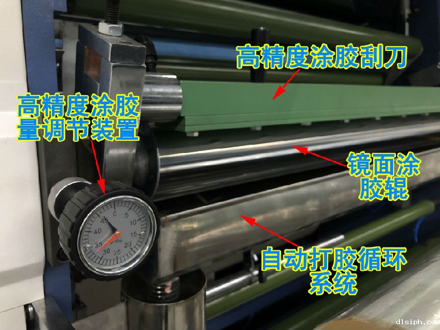 采用高精度涂胶调节装置,通过控制涂胶刮刀与涂胶辊之间的位置轻松调整涂胶厚度,涂胶均匀,从而满足生产需要,同时节约生产成本。