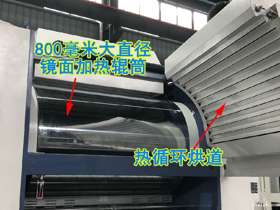 干燥部分采用直径800mm大型镜面干燥辊筒,配备电磁加热装置,辅以烘道热循环系统,在降低加热时间,提高加热效果,保证覆膜质量的同时,热循环系统又能节省大量能耗,从而在提高生产效率的同时控制生产成本。