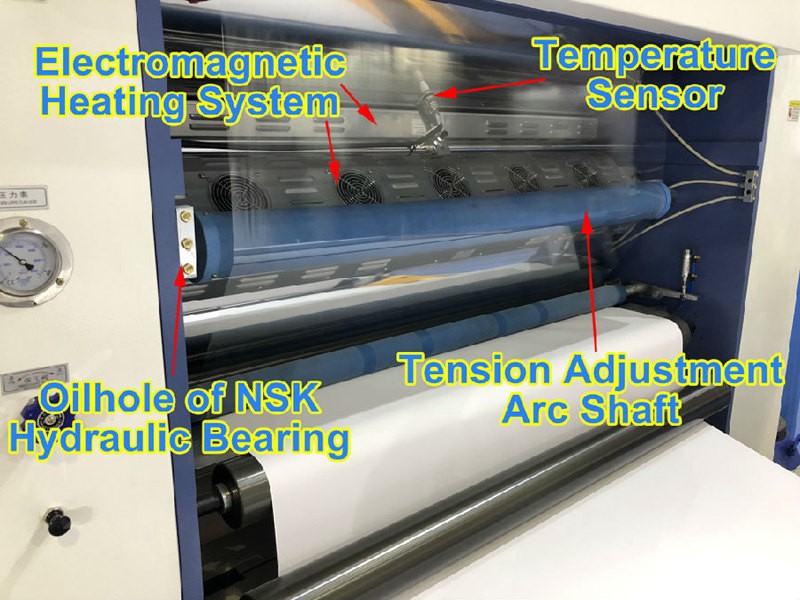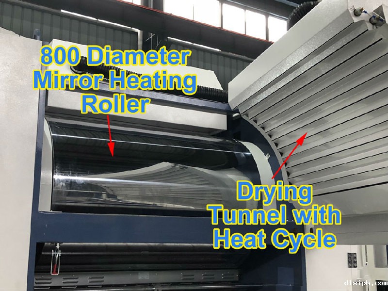 Adopt 800mm diameter big mirror heating roller, equipped with electromagnetic heating system, high heating speed and performance, at the same time the heat cycle system and hot air cycle system can save much energy.